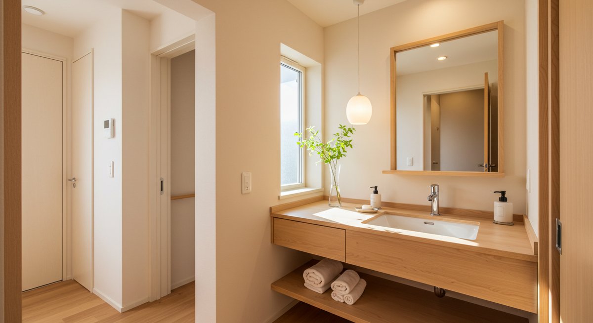 寝室横に洗面台を設けると、起床から着替え、身だしなみの確認が一連で行えます。ミニドレッサー的な設置にすれば鏡と収納がまとまり朝の準備がスムーズになります。